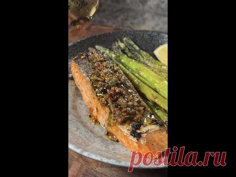 На изображении представлено блюдо, состоящее из куска лосося и спаржи, размещенных на серой керамической тарелке. Лосось приготовлен с использованием сочного чесночного сливочного соуса, который придает ему аппетитную золотистую корочку. Рыба богато покрыта зеленовато-коричневой корочкой со специями и рубленым чесноком, что добавляет текстурности. На фоне виднеется деревянная поверхность, придающая кадру уютную атмосферу. Около лосося расположена хрустящая зеленая спаржа, ее яркий зеленый цвет контрастирует с глубоким оранжевым оттенком рыбы. Рядом лежит кусочек лимона, который добавляет визуальную свежесть и может быть использован для усиления аромата блюда. Освещение мягкое, акцентирует на текстуре ингредиентов. Композиция позволяет ощутить полное погружение в процесс приготовления и наслаждение вкусами свежеприготовленного обеда. Общая атмосфера изображения создает ощущение домашнего уюта и роскоши одновременно, побуждая обратить внимание на качество и изысканность представленного блюда.
