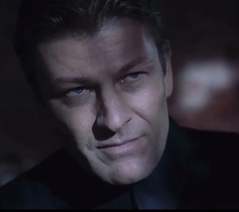 На изображении изображен человек с серьезным выражением лица, находящийся при слабом освещении. Его взгляд направлен прямо на зрителя, что создает ощущение тайны и интриги. Лицо освещено мягким светом, подчеркивающим строгие черты и придающим кадру драматичность. Волосы уложены аккуратно, стиль- классический, темный пиджак дополняет образ серьезностью и элегантностью. В тени боковых частей лица угадывается многослойная композиция. Темный фон оставляет на воображение простор, что может вызывать различные ассоциации у зрителя, кроме того, нечёткий текст в правом нижнем углу добавляет элемента загадки и возможной информационной перегруженности. Общее ощущение - это сцена из драматического фильма или может даже шпионского триллера, что усиливается напряжением и сосредоточенностью героя.