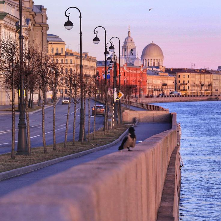 На изображении запечатлён городской пейзаж Санкт-Петербурга на закате. На переднем плане видна набережная с изгибающимся тротуаром из бледно-розового камня, по которому сидит одинокая ворона. Позади простирается водная гладь реки, отражая небо с розовыми и сиреневыми оттенками. По левую сторону расположена линия деревьев с голыми ветвями, за которой простирается дорога, на которой нет автомобилей. Архитектурный облик города передаёт сочетание старинных зданий, доминирует купол одного из исторических зданий с серым оттенком, а также яркое красное здание, выделяющееся на фоне более нейтральных тонов. Уличные фонари с ретро-дизайном подчеркивают атмосферу вечернего города. Общее освещение тёплое и мягкое, создающее атмосферу спокойствия и уюта. По композиции красивая игра перспективы, создающая глубину и пространственное измерение между передним планом набережной и задним планом городских построек.
