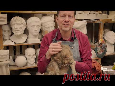 Изображение показывает мужчину, сидящего перед стеллажом с множеством гипсовых бюстов. Мужчина одет в красную рубашку и джинсовый фартук, что придаёт ему вид скульптора или художника. В его руках находится рыжая кошка, которую он держит бережно. Мужчина улыбается, создавая тёплую и дружелюбную атмосферу. На заднем плане, помимо бюстов, заметна деревянная полка и эмалированная палитра с цветными красками. Присутствующий текст добавляет интеллектуальный и культурный контекст в изображение. Освещение мягкое и рассеянное, что подчёркивает детали объектов и придаёт снимку глубину. Композиция сбалансирована, с центром внимания на человеческой фигуре и её взаимодействии с кошкой. Атмосфера вдохновения и мастерства в мировом контексте искусства и творчества.