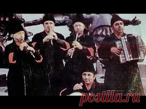 На изображении представлена группа мужчин, одетых в традиционные грузинские костюмы с черной и красной цветовой гаммой. Каждый из них держит музыкальный инструмент: несколько дудок и аккордеон. В центре внимания групповой снимок с пятью музыкантами, которые исполняют мелодию, судя по их сосредоточенным выражениям лиц и положению пальцев на инструменте. Мужчины носят черные шапки, что может указывать на национальную принадлежность их нарядов. На фоне видны фрагменты скульптуры, возможно, в пространстве на открытом воздухе. Яркость изображения смягчена, создавая тёплую атмосферу. Фраза "ნამდვილი ძველი ქსოვრელები მღერიან. Qsovrelebi mgerian", расположенная рядом, подчеркивает культурное значение сцены, возможно указывая на традиционное грузинское пение. Световые акценты распределены равномерно, без чётких теней, что придаёт фотографии слегка винтажный оттенок. Общее настроение изображения передает ощущение времени и погруженности в культурное наследие.