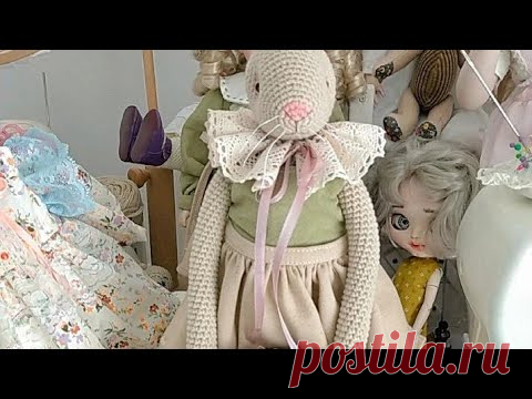 На изображении изображена вязаная крючком игрушка в виде зайца с длинными ушами и аккуратной мордочкой. Заяц одет в зеленую одежду с нежным розовым бантиком и кружевным воротником. Вокруг видны различные элементы рукоделия, включая текстильные куклы и пышные платья с цветочным узором и кружевами, что создает атмосферу умиротворенности и творчества. Кукла с кудрявыми светлыми волосами смотрит из-за зайца, на её лице выражение любопытства. Освещение мягкое, создающее уютное восприятие. На заднем плане теплые тона и деревянные элементы, придающие общему виду винтажный стиль. Композиция сбалансирована, передний план отображает текстуры ткани и вязки. Это ощущение уюта связано с хобби, таким как шитье и вязание, и передает атмосферу домашних ремесел и мира творчества.
