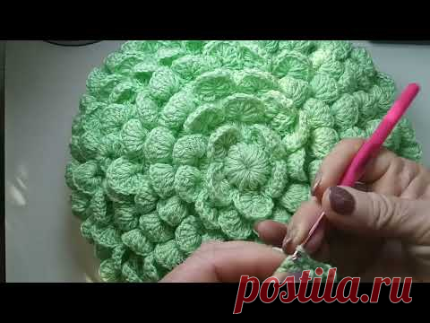 Изображение показывает процесс вязания декоративной подушки крючком. В центре кадра видна большая круглая подушка насыщенного зелёного цвета, выполненная из мягкой пряжи, образующей текстурные, выпуклые узоры, напоминающие цветочные лепестки, уложенные рядами. Рядом с подушкой расположены руки человека, который держит розовый крючок и продолжает вязание. Его руки сосредоточены, пальцы аккуратно держат рабочую нить. Обстановка освещена естественным светом, создающим тёплую, уютную атмосферу. Вязание добавляет ощущение уюта и творчества. Зелёный цвет подушки символизирует природу и свежесть, а мягкая текстура пряжи подчёркивает комфорт в интерьере. Надпись "ВЯЖЕМ ДЕКОРАТИВНУЮ ПОДУШКУ" подходит к изображению, акцентируя внимание на процессе создания вещи. Композиция проста и фокусирует внимание на рукоделии.