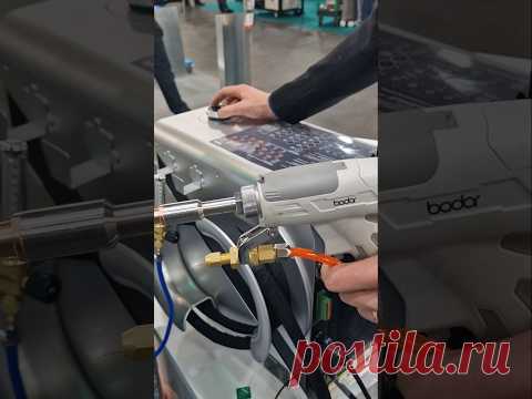 На изображении виден момент использования промышленного лазерного оборудования, маркированного логотипом компании Bodor. Основное внимание сосредоточено на руке человека, держащей лазерный инструмент, корпус которого выполнен в сером цвете. Оранжевый и синий шланги подключены к прибору, указывая на сложную технологическую систему. Мужчина в темной одежде управляет устройством с помощью кнопок на контролере, который находится на панели управления серебристого цвета с множеством кнопок. На заднем плане видна часть помещения, предположительно, цеха или выставки, с индустриальным интерьером и бетонным полом. Освещение яркое, подчеркивающее детали оборудования. Эмоциональная атмосфера нейтральная, фокус на профессионализме и точности работы. Текст "❌❌❌ ПРИНИМАЕМ ЗАКАЗЫ ПО ВСЕМУ МИРУ" говорит о глобальной доступности продукции и услуг от компании.