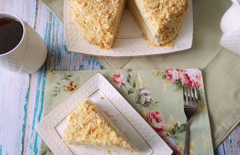 На изображении представлен легендарный торт «Наполеон», традиционно ассоциирующийся с детством и новогодними праздниками. Он размещен на светлой тарелке с характерным узором. На переднем плане виден аппетитный треугольный кусок торта с рассыпчатой текстурой. Рядом расположена вилка. Цвет торта — золотисто-бежевый, что подчёркивает его свежесть и мягкость. На заднем плане находится целый торт, более высокая часть. Поверхность стола декорирована тканевыми элементами с цветочным узором, создающими атмосферу домашнего уюта. Справа заметна салфетка. В левой части кадра стоит белая чашка с чаем, что добавляет общей теплоты картине. Все элементы композиции расположены на светлом фоне с белым деревом, что подчёркивает нежность и воздушность изображения. Освещение естественное, мягко распределенное, создающее приглушенный, но живой эффект. Текст сбоку описывает классический рецепт приготовления, связывая образ с кулинарными традициями.