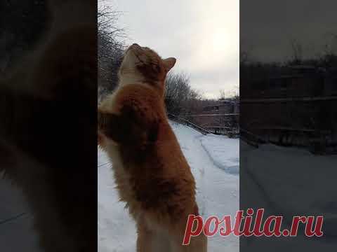 На изображении представлен рыжий кот, стоящий на задних лапах в заснеженном дворе. Шерсть кота густая, рыжего цвета с белыми отметинами. Кот смотрит вверх, создавая впечатление заинтересованности или ожидания. Фото снято на открытом воздухе, на фоне зимнего пейзажа с голыми деревьями и покрытой снегом землей, что придает изображению атмосферу зимней свежести. Небо облачное, что обеспечивает рассеянное, мягкое освещение сцены. Окейное освещение подчеркивает текстуру шерсти кота, делая её более выразительной. Композиция кадра включает в себя кота на переднем плане, что акцентирует внимание на его позе и выражении морды. Вдалеке виднеется невысокий забор и несколько укрытых снегом строительных конструкций, что добавляет глубину изображению. Это может быть деревенская местность или окраина небольшого городка, судя по окружающей обстановке.
