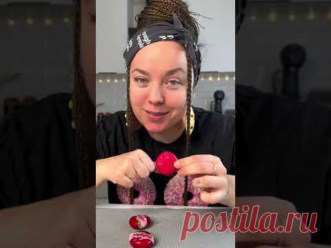На изображении присутствует женщина с дружелюбным выражением лица, держащая в руках пищевой объект ярко-красного цвета. Она одета в чёрную футболку с розовыми принтами в форме пончиков. Её волосы заплетены в косички, поверх которых надета чёрная повязка с узором. На заднем плане виден неясный интерьер с приглушённым освещением. Все детали создают атмосферу непринужденности и лёгкого юмора, подчёркивая эмоциональное послание – "Дорого, но вкусно 😄 #пробуемеду #мукбанг #полимернаямама #мамуляодобряет". Вся обстановка и выражение лица женщины создают впечатление, что она делится личными впечатлениями о вкусе пищи, что может быть связано с популярными видеотрансляциями и мукбангами, в которых люди пробуют и обсуждают различные блюда. Насыщенные цвета на переднем плане контрастируют с мягким фоном, что привлекает внимание к основному объекту в руках.
