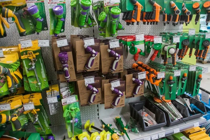 Изображение демонстрирует витрину в магазине с богатым выбором садовых инструментов. Видны полки, уставленные ручными распылителями различных брендов и моделей. Продукты размещены на перфорированных стендах, среди которых заметны ярко-зеленые и оранжевые пистолеты для полива с элементами фиолетового цвета. На некоторых из них присутствуют упаковки с надписью "La Note". Вся сцена освещена мягким, рассеянным светом, подчеркивающим цветовую палитру. На фоне видно множество упаковок, каждый из которых имеет разнообразные формы и размеры. Обилие информации на ценниках может включать технические спецификации продуктов. Слева разные модели, такие как "FIT", придают вибрацию торговому пространству. Текст "Деревья и кусты в саду плачут от такого ухода: как исправить все за 1 день. Народные советы, которые могут повысить урожайность в вашем саду." идейно соединяется с тематикой садоводства и ухода за растениями.