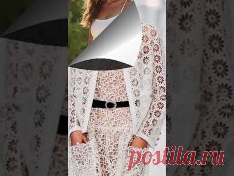 На изображении представлен стильный женский наряд, выполненный в технике кружевного вязания. Основной акцент сделан на открытом кардигане и юбке, которые выполнены из белого кружева с цветочным узором. Ткань прозрачная и легкая, что создает воздушное впечатление. Под кардиган надет топ белого цвета, гармонирующий с общим ансамблем. На талии черный пояс, добавляющий контраст и акцентирующий фигуру. Текстура кружева поражает своей сложностью и утонченностью, придавая одежде изысканный вид. Женщина на изображении выглядит расслабленно, с естественным положением рук в карманах, что придает композиции непринужденность. Природный свет придаёт всему образу свежесть и яркость. Общая палитра представлена спокойными белыми и черными оттенками, создающими стильный и элегантный контраст. Так как рядом указано "ИДЕИ ДЛЯ ВЯЗАНИЯ #shotrs", можно предположить, что изображение вдохновляет на создание подобных вязаных нарядов.