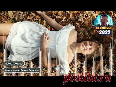 На изображении расположена девушка, улыбающаяся лежа на земле, покрытой осенними листьями. Она одета в легкое белое платье, которое контрастирует с теплой палитрой коричневых и золотистых оттенков листьев. Свет мягкий, природный, создающий теплую и уютную атмосферу. Лицо девушки выражает радость и расслабленность, ее руки свободно раскинуты. В верхнем углу изображен логотип с текстом "DJ СИНИЦЫН - Мой Эдем", рядом помещена дата 2025. Композиция изображения передает ощущение гармонии с природой, глубина изображения создается за счет различного фокуса на переднем и заднем плане. Наряду с изображением имеется текст "ROM.COM.RU" и указание на автора стихов Романа Синицына, что добавляет элемент мультимединости. Стиль снимка можно воспринять как современный, выражающий обновление и надежду.
