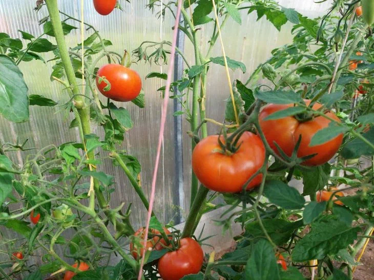 На изображении представлено несколько кустов томатов в теплице. Томаты имеют насыщенный красный цвет, который выделяется на фоне зелёных листьев растения. Видно, что томаты созрели и готовы к сбору. Тонкие стебли растений аккуратно подвязаны розовой верёвкой, что помогает им сохранять форму и не перегибаться под тяжестью плодов. Фон сделан из полупрозрачного материала, вероятно, это пластиковая пленка теплицы, сквозь которую пробивается естественный дневной свет, мягко освещая растения. Общее впечатление от изображения — благоприятное, подчёркивающее сельскохозяйственный и увлечённый характер ухода за растениями. Тема борьбы с вершинной гнилью также отражается в контексте, создавая атмосферу заботы и осознания проблем, связанных с выращиванием томатов.