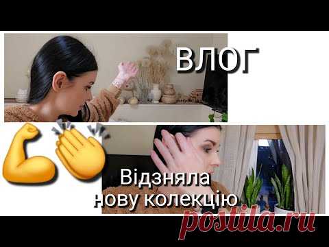 Изображение состоит из двух фотографий. На верхнем фото женщина с темными волосами и собранной прической, одетая в коричневый свитер, сидит в комнате с минималистичным декором. На фоне бежевые стены и полки с элементами декора, такими как вазы и сухие растения. Освещение мягкое, придающее уют атмосфере. На фото надпись "ВЛОГ". Нижнее фото показывает ту же женщину, поворачивающую лицо вбок. Здесь она находится в помещении с теплыми шторами и зелеными растениями на подоконнике, создающими ощущение уюта и уединения. Виден текст на украинском языке "Відзняла нову колекцію" и эмодзи в виде мускула и хлопка. Комната освещена теплым светом, добавляющим домашний характер изображению. Общее восприятие включает спокойствие и уют, внимание к деталям домашнего интерьера и личное пространство.