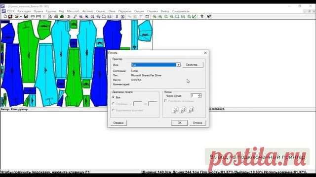 На изображении представлен интерфейс программного обеспечения для раскладки лекал. Центр экрана занимает диалоговое окно "Печать", в котором можно выбрать параметры печати, такие как "Имя бумаги" и "Общий вид". Окно расположено на фоне экрана с лекалами, которые выделяются яркими цветами: насыщенным синим, зеленым и бирюзовым. Лекала имеют сложную геометрическую форму и расположены по всему экрану в виде мозаики. Сверху интерфейс дополнен множеством значков и кнопок, с помощью которых можно управлять программой. Белый фон и черные линии и шрифты создают контраст, облегчая восприятие информации. Верхняя часть окна диалога содержит текстовые поля и кнопки для взаимодействия с программой. Внизу экрана можно заметить строку состояния с дополнительной информацией о параметрах программы. Атмосфера изображена в офисном стиле, предназначенном для профессиональных задач.
