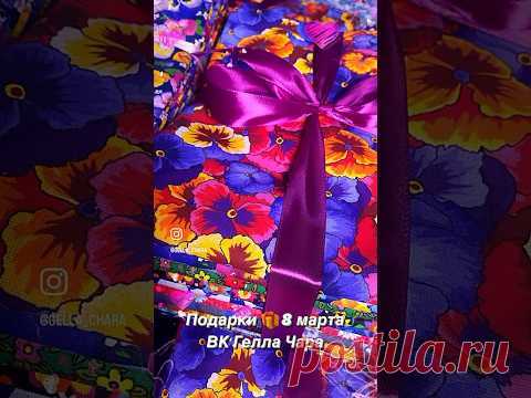 На изображении представлена яркая подарочная упаковка с красочным дизайном. Центральное место занимает коробка, обернутая яркой тканью с узором из разноцветных цветов, где преобладают оттенки синего, красного и желтого. Коробка перевязана широкой атласной лентой насыщенного пурпурного цвета, завязанной в аккуратный бант. Фон изображает текст, написанный на русском языке, связанный с предложениями подарков на 8 марта. Упаковка имеет праздничный и жизнерадостный вид, создавая настроение радости и ожидания торжества. Освещение изображено как теплое и мягкое, создавая уютную атмосферу. Логотипы и текстуры намекают на использование социальных медиа для продвижения подарков. Композиция ориентирована на вертикаль, с фокусом на центральные элементы и декоративные детали, привлекающие внимание зрителя к изделию. Объект окружен другими подарочными упаковками, что усиливает ассоциацию с праздничным событием.