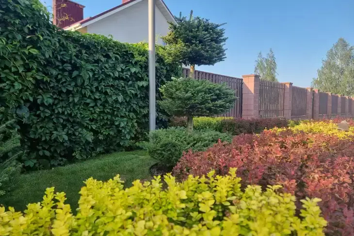 На изображении представлена частная территория с участком, оформленным в изысканном ландшафтном стиле. На переднем плане видны густые кустарники с листьями насыщенного зелёного и бордового цветов, создающие эффектный контраст. На заднем плане расположена кирпичная стена, переходящая в забор, который тянется вдоль всей сцены, намекая на уединённость этого участка. Изящно подстриженные вечнозелёные растения создают иллюзию ухоженности и порядка. На участке также можно заметить высокое дерево с симметрично обрезанной кроной, придающее картине классическую эстетичность. Светлое небо и едва заметный солнечный свет создают ощущение тихого летнего утра. Текст рядом с изображением обращает внимание на важность продуманного подхода к ландшафтному дизайну и предостерегает от поспешных решений, подчёркивая значимость правильного выбора растений и их расположения.
