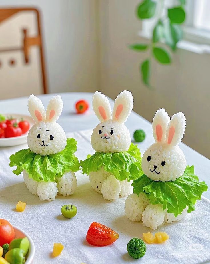 На изображении представлена креативная сервировка стола с тремя фигурками зайцев, сделанных из белого риса. У каждой фигурки есть маленькие белые ушки с розовыми вставками и милые нарисованные черные глаза и рот. Зайцы одеты в «воротники» из свежих зеленых листьев салата. Рядом расположены кусочки разноцветных овощей: красный помидор, жёлтый перец и зелёные брокколи. Стол покрыт белой скатертью, которая создает ощущение чистоты и свежести. Фон размыт, но видно зеленое растение на подоконнике, что придаёт картине уют и свежесть. Освещение естественное и мягкое, что подчеркивает спокойную и уютную атмосферу. Рядом с ведущим мотивом можно увидеть ярлычок с текстом ".".