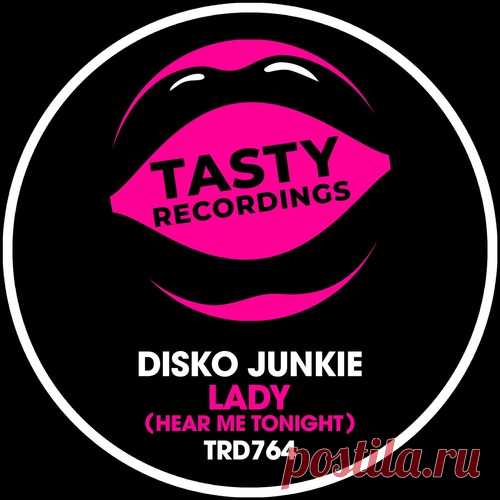 Изображение представляет собой круглую эмблему с черным фоном, в центре которой находится розовая фигура в виде губ с белыми световыми бликами. Надпись "TASTY RECORDINGS" размещена по центру этой фигуры. Под губами расположено текстовое описание "DISKO JUNKIE", а также "LADY (HEAR ME TONIGHT) TRD764", выполненное также в белом цвете. Присутствующий контраст между розовым и черным цветом, в сочетании с белым текстом, создает яркую и заметную композицию. Контурная линия эмблемы белого цвета придает изображению завершенность. Эта композиция схожа с визуальным стилем музыкальных альбомов, создающим атмосферу ночного клуба или дискотеки. В целом, дизайн может ассоциироваться с эстетикой 80-х и 90-х годов, когда популярными были яркие цвета и графические элементы. Свет и тени на губах придают им объём, создавая впечатление трёхмерности.