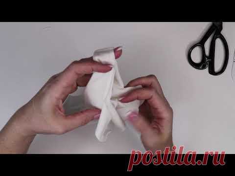 На изображении показаны чьи-то руки, которые держат кусок белой ткани. Сложенные, аккуратные пальцы придают композиции особый акцент, подчёркнутый мягким розовым оттенком ногтей. На фоне можно заметить белую поверхность, создающую нейтральное и спокойное пространство снимка. Слева от рук на белой поверхности находятся большие черные ножницы с глянцевой текстурой, которые намекают на процесс шитья или рукоделия. Ткань выглядит мягкой и эластичной, её светлый оттенок гармонирует с приглушенной атмосферой фотографии. Видимое действие и взаимодействие рук с тканью создают ощущение сосредоточенности и внимательности, будто это мастер-класс по созданию одежды для кукол. Освещение естественное, позволяющее детали изображения быть четкими и хорошо различимыми. Образ дополнен надписью, что делает его более информативным для зрителя, интересующегося рукоделием или шитьём, особенно мастер-классом от Наталии Лыковой.
