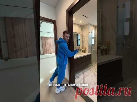 На изображении показан мужчина, одетый в уютный синий спортивный костюм и белые кроссовки, стоящий в проеме двери. Он указывает на современную ванную комнату, декорированную мраморной плиткой. Помещение залито мягким естественным светом, исходящим из незаполненного окна, видимого на заднем плане. На полу блестящая плитка, создающая ощущение роскоши и чистоты. Ванная комната оснащена современными сантехническими приборами и стильной мебелью. В целом изображение передает атмосферу комфорта и современного интерьера с элементами элегантности. Выражение лица мужчины сосредоточенное и заинтересованное, что подчеркивает его увлеченность темой румтура дома площадью 350 м², подчёркивая такие ключевые элементы, как отдельный санузел. Предметы интерьера демонстрируют тщательно подобранный стиль, что особенно выделяется на фоне светлых, уютных тонов помещения.