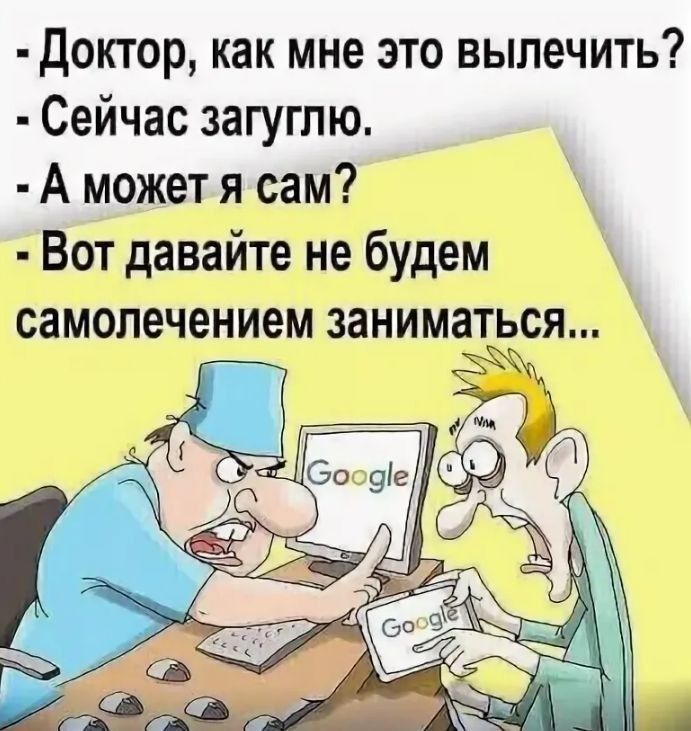 На изображении показана забавная сценка в кабинете врача. Слева сидит врач в традиционной медицинской униформе: голубом халате и шапочке. Его лицо выражает строгость и решительность, а он указывает пальцем в сторону мужчины, который сидит напротив. Пациент в очках выглядит удивленным и слегка обеспокоенным, в одной руке он держит смартфон, на экране которого виден логотип Google. Врач также указывает на монитор компьютера с тем же логотипом. Этот комичный момент сопровождается текстом диалога, где пациент предлагает "загуглить" свои симптомы, но врач отказывается от такой идеи, предупреждая о самодиагностике. На фоне присутствует светло-желтая стена, создающая яркую и позитивную атмосферу. Этот рисунок иллюстрирует типичную ситуацию неверного использования интернета для нахождения медицинских решений без профессиональной помощи.
