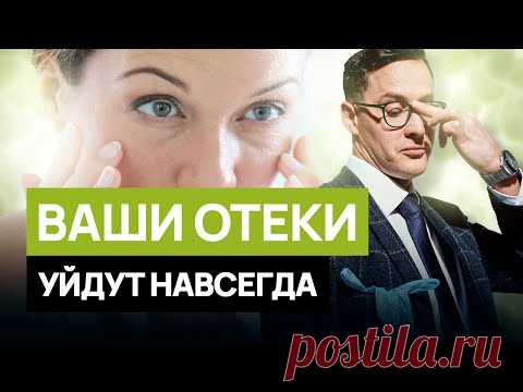 Изображение содержит две фигуры на светлом фоне. Левая часть изображения демонстрирует женщину, касающуюся пальцами области под глазами. У нее светлая кожа, темные волосы, завязанные назад, и выразительные голубые глаза, глядящие вперед. Правее расположен мужчина в строгом костюме, белой рубашке и галстуке. Он носит очки и слегка касается пальцем области вокруг глаз, словно выполняет массажное движение. Ему около сорока лет, и он выглядит уверенно. Контраст мужчин и женщин подчеркивает общий образ заботы о здоровье и внешнем виде. Надпись на изображении гласит: "Ваши отеки уйдут навсегда", оформлена белыми буквами на зеленом фоне, что придает освежающую и надежную атмосферу содержимому. Цветовая палитра включает в себя оттенки зеленого, белого и черного, что делает текст четким и легко читаемым. Искусственное освещение создает яркость и подчеркивает детали лиц, подчеркивая действия, связанные с уходом за кожей.