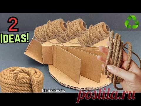 На изображении представлена креативная идея использования остатков ткани и обычного картона, чтобы создать уникальный предмет. Фон выполнен в нейтральных серых тонах, которые подчеркивают элементы переднего плана. В центре внимания — развернутый картон, сложенный в конструкцию, напоминающую подставку или держатель. Текстура картона четко видна, указывая на его простоту и доступность. Спереди размещены рулоны грубой веревки натурального цвета, придающие всей инсталляции нотку экологичности и эко-дизайна. Веревка также удерживается в руке человека, чьи пальцы видны на изображении, свидетельствуя о процессе создания изделия. Свет акцентирует внимание на центральных деталях композиции. В левой части изображения можно заметить текст "Incredible IDEA made from leftover Fabric and Regular Cardboard! The Best of waste♻️2 IDEAS ♻️💰♻️", подчеркивающий тему утилизации и выхода за рамки обычного. Верхний правый угол украшен символом переработки, а на изображении заметен логотип "MAGICALCRAFTS", что может указывать на бренд или сообщество, занимающееся ремесленными проектами. Вся композиция вдохновляет на креатив, подчеркивая ценность переработанных материалов и переделки обыденного в уникальное.