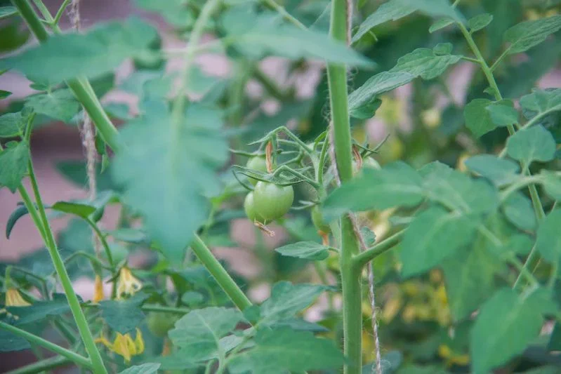 На изображении представлен крупный план томатного растения, которое очевидно находится в фазе роста. В центре кадра можно заметить мелкий зелёный помидор, который ещё не созрел. Растение обладает типичными чертами томата: зелёные продолговатые и зубчатые листья, тонкие стебли и жёлтые цветы, что указывает на процесс цветения. Текстура листьев гладкая, а цвет варьируется от насыщенно-зелёного до мягких светло-зелёных оттенков. Свет на изображении естественный и дневной, что говорит о съёмке, проведённой, возможно, в летнее время. В кадре отсутствуют люди, что создает спокойную атмосферу. Фон размыт, сосредоточеность на переднем плане помогает выделить растение. Этот контраст создаёт баланс и акцентирует внимание на объекте. Растение окружено другими стеблями и листвой, что добавляет глубину и чувство густой растительности. Экспозиция настроена так, чтобы естественные цвета выглядели мягко и реалистично.