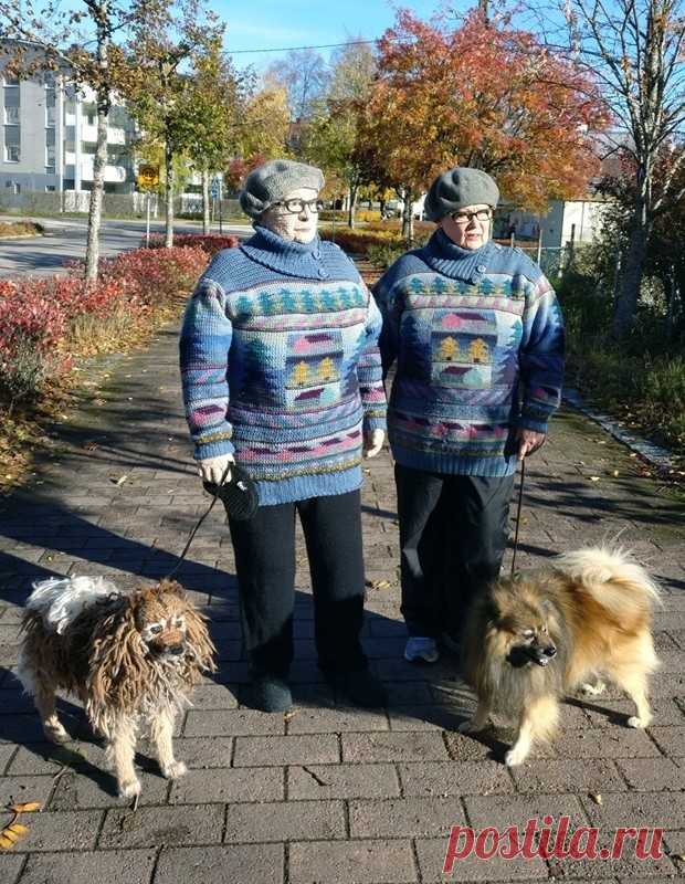 На изображении видно две фигуры, которые кажутся искусно связанными куклами в человеческий рост. Они стоят на мощеной дорожке, одетые в яркие свитера с изображениями деревьев и домов. Светлые и темные оттенки синего, зеленого и фиолетового преобладают, что придает картине оттенок прохладного осеннего дня. На головах у обеих фигур связаны шапки-бере, подчеркивающие гармонию в их образах. Телеки своими руками создают ощущение домашнего уюта и творчества. Всадку держатся два собаки, один из которых выглядит как вязаная копия настоящей. По обе стороны от фигур растут цветущие кусты и деревья с яркими осенними листьями, красными и желтыми оттенками, создавая атмосферу близости к природе. На заднем плане серые здания контрастируют с теплотой природы и подчеркивают уют и теплоту свитеров. Мягкий солнечный свет добавляет снимку приятную игру теней и света, создавая глубину композиции. Это изображение, словно этюд осеннего дня, выражает гармонию человека и природы через искусство вязания.