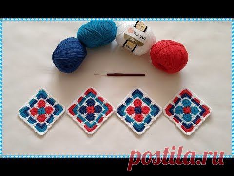 На изображении представлены четыре разноцветных вязанных квадрата (гранни-квадраты), которые выложены в ряд на светлом фоне. Каждый квадрат выполнен в красных, синих и белых цветах, что создает яркий и привлекательный узор. Рядом с квадратами лежат три клубка пряжи: один белый, один красный и один синий, с видимой этикеткой "YarnArt", что указывает на бренд пряжи. Между клубками и квадратами размещен металлический крючок для вязания, что говорит о процессе создания этих узоров. Фон светлый и нейтральный, подчёркивая яркость и насыщенность цветов пряжи и квадратов. Визуальная композиция тщательно выстроена, создавая симметрию и акцентируя внимание на ручной работе. Изображение имеет комфортное освещение, подчеркивающее текстуру пряжи и узоров, создавая ощущение тепла и уюта. Присутствие крючка указывает на ручную работу, а разнообразие узоров предлагает возможности для дальнейшего творчества, такие как создание пледов или покрывал. Атмосфера изображения вдохновляет на создание собственных вязальных проектов, отражая желание делиться своим мастерством и красотой. Появление фразы на турецком языке может подсказать о мотивирующем контексте и советах по рукоделию.