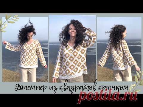 Изображение показывает женщину с длинными кудрями, одетую в вязаный джемпер из бабушкиных квадратов. Джемпер выполнен в белом и коричневом цветах, создавая геометрический узор. На заднем плане виднеется морской пейзаж под ясным голубым небом. Женщина стоит на открытом воздухе, на холме, с видом на море, что создает чувство свободы и свежести. Она улыбается, создавая атмосферу спокойствия и радости. Позы на трех изображениях варьируются: в первом она смотрит вниз с раскованной позой, во втором подняла руку, касаясь волос, а в третьем повернулась в профиль. Светлые брюки дополняют образ, придавая ему легкость. Световые условия ясные, что подчеркивает объем и текстуру вязаного изделия. В композиции использованы растительные элементы, придающие изображениям естественный и гармоничный вид. Цифровой коллаж в трех частях дополняет надпись, подчеркивающая веяние рукоделия и домашнего уюта.