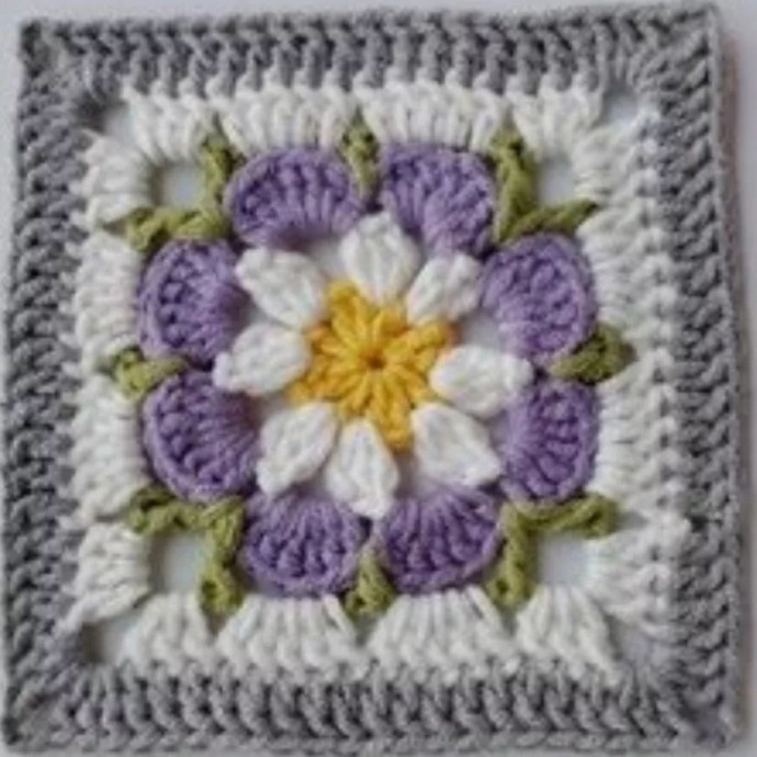 На изображении представлено квадратное вязаное мотивное полотно с центральным цветочным узором. В центре композиции находится цветок, имеющий ярко-жёлтую сердцевину, окружённую белыми и светло-фиолетовыми лепестками, которые создают эффектный визуальный акцент. Зелёные элементы между лепестками имитируют листья, добавляя природную тематику. Основной фон изделия выполнен из белой пряжи, а внешняя рамка квадрата представляет собой серый вязаный узор, создающий контраст и завершённость композиции. Вязка состоит из многочисленных текстурных элементов, аккуратно переплетающихся друг с другом. Материал, использованный в изделии, на вид мягкий и вероятно сделан из шерсти или акрила, что подходит для создания уютных и декоративных предметов интерьера. Композиция в центре играет важную роль, привлекая внимание к деталям. Квадратные мотивы часто используются в создании пледов, подушек и других домашних аксессуаров. Изображение создаёт домашнюю и тёплую атмосферу, благодаря использованию классических пастельных тонов и форм.