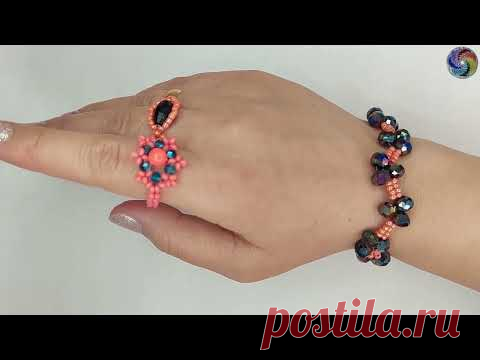 На изображении представлена рука, украшенная красивыми бисерными изделиями. На среднем пальце надето кольцо, выполненное из розового бисера с черной каплей в центре, создавая впечатление элегантности. Браслет из аналогичного материала украшает запястье, с элементами темного перелива, возможно, из гематита или другого камня, которые ярко выстреливают на фоне нежно-розового бисера. Рука находится на нейтральном белом фоне, что подчеркивает яркость украшений, делая их центральным элементом композиции. Бисерные сетки и украшения создают текстурное разнообразие, детали бисера и камней добавляют глубину и визуальный интерес. Сочетание цветов розового и черного создает современный и модный вид. Искусное плетение бисера с капелькой придает украшениям утонченность. Свет равномерно освещает сцену, подчеркивая отражающий блеск камней и четкость линий бисерного плетения. В верхнем правом углу можно заметить многоцветный элемент, добавляющий динамику общему изображению.