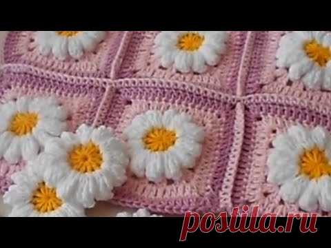 Изображение демонстрирует красивое вязаное изделие, оформленное в технике «Бабушкин квадрат». Оно состоит из множества квадратов пастельного розового цвета, в каждом из которых в центре расположен белоснежный цветок с ярко-жёлтой серединкой. Вязаное полотно создаёт ощущение уюта и домашнего тепла. Текстура изделия мягкая, пушистая, как типичный элемент рукотворного декора. Фон нейтральный, привлекая больше внимания к цветочным узорам. Цветовая палитра гармонична, и преобладают нежные пастельные тона с акцентами жёлтого и белого. Такие элементы часто используются для создания покрывал, пледов или одежды и несут в себе элементы традиционного рукоделия. Искусная работа мастера подчёркивается точностью вязания и аккуратностью композиции. Возникает ассоциация с уютными домашними интерьерами, где такие изделия оживляют атмосферу.