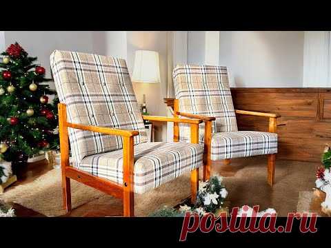 На изображении представлена уютная гостиная, оформленная в праздничном стиле. В центральной части кадра размещены два старинных кресла с деревянными каркасами и обивкой в клетчатый узор, состоящей из классических коричневых и бежевых оттенков. Обстановка вокруг создает теплую, домашнюю атмосферу: слева стоит новогодняя елка, украшенная яркими шарами и светящимися гирляндами. В правой части виден деревянный шкаф или панель, а в углу - торшер с мягким светом, создающий приятное освещение. На полу расстелен светлый ковер, добавляющий уюта и тепла в интерьер. Фон оформлен в нейтральных тонах, что подчеркивает царящую атмосферу спокойствия и комфорта в помещении.