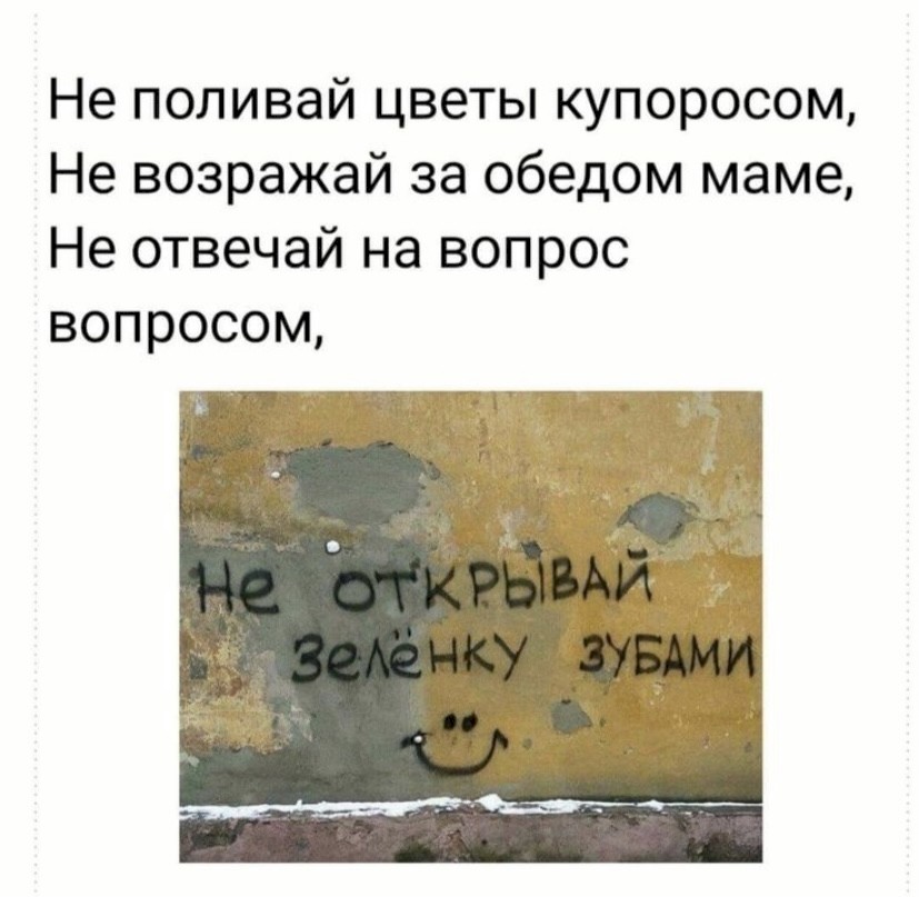 На изображении видна стена с текстом, состоящим из сочетания советов и юмористических напоминаний. В верхней части присутствуют фразы на белом фоне, написанные в черном цвете, такие как: "Не поливай цветы купоросом, Не возражай за обедом маме, Не отвечай на вопрос вопросом". Под этой частью изображена фотография стены, где черной краской написано: "Не открывай зелёнку зубами". Стена имеет текстуру грубой штукатурки, цвет — желтовато-бежевый с серыми пятнами. По характеру почерка и заборного стиля надписей, это напоминает граффити, что добавляет атмосферу непринужденной иронии. Рядом с текстом нарисовано улыбающееся лицо, что еще больше подчеркивает юмористический подтекст. В правом нижнем углу красными буквами обозначено имя источника. Освещение естественное, но стене есть следы выветривания, что добавляет глубины и текстурности композиции.