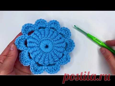 На изображении видно, как пара рук держит вязаный подставочный цветок ярко-голубого цвета, выполненный из шерстяной пряжи. Этот цветок состоит из симметричных лепестков, которые создают текстурированную и привлекательную форму. Рядом с подставкой лежит зеленый крючок для вязания с металлизированным покрытием, что указывает на инструмент, используемый в этом процессе. Фон изображения белый, создающий контраст и делая детали более заметными. Внимание сосредоточено на цветке и инструменте, что создает ощущение уюта и домашнего рукоделия. Текст "Very Unique and EASY Coaster Flower - Step by step instructions" намекает на учебный процесс, связанный с вязанием этого подставочного цветка, который может быть выполнен легко и быстро. Освещение ровное, без теней, подчеркивающее четкость изображения. Композиция имеет центрированную перспективу, показывающую взаимодействие между объектами и процессом создания. Отсутствие других элементов в кадре делает образ сконцентрированным и тематическим.