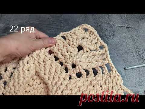 На изображении женщина удерживает часть вязаного изделия из полиэфирного шнура, которое имеет сложный узор с видимыми отверстиями и текстурой из толстой пряжи кремового оттенка. Видно, что работа сделана вручную на серой поверхности, при этом рядом расположены серебристый крючок и надпись "22 ряд", указывающая на прогресс работы. Пальцы аккуратно ухватывают краешек вязания, демонстрируя технику и мастерство выполнения. Цвета в основном нейтральные, с акцентом на рукоделие и детали изделия. Свет мягкий, равномерно распределённый, без резких теней. Атмосфера спокойная и творческая, передающая усердие и внимание к деталям в процессе создания коверка от ПРОМТЕКС.