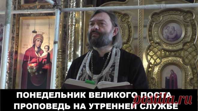 На изображении запечатлён момент православного богослужения, проводимого в храме, с архитектурой характерной для русской традиции. Виднеется священник с выразительной седой бородой, облачённый в чёрное облачение с белыми узорами, занимающий центральное место. В руках он держит книгу, возможно Библию, указывающую на чтение молитв или проповедь. На заднем плане видна икона с изображением Богородицы и младенца, выполненная в стиле русской иконописи, где доминируют золотые и красные оттенки. Золотая рама иконы украшена сложным орнаментом, а рядом можно увидеть свечи и церковный декор, что добавляет величавости и священной атмосферы изображению. Священник выглядит серьёзным и сосредоточенным, его взгляд направлен вперёд. Освещение в храме мягкое, естественное, придающее сцене глубину и торжественность. Надпись внизу «ПОНЕДЕЛЬНИК ВЕЛИКОГО ПОСТА ПРОПОВЕДЬ НА УТРЕННЕЙ СЛУЖБЕ» подчёркивает религиозный контекст и значимость момента, связанного с Великим постом.