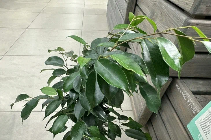 На изображении представлен зеленый фикус, который располагается на светлых керамических плитках. Листья фикуса насыщенно-зеленого цвета, гладкие и блестящие, что свидетельствует о его здоровье. Растение находится возле деревянной стены, выполненной в серых и коричневых тонах, что создает контраст с зеленью листьев. Освещение падает мягко, создавая приятный и естественный свет, подчеркивающий форму и текстуру листьев. Растение выглядит ухоженным, возможно, благодаря использованию специальных средств, о чем может намекать размещенный рядом текст. Этот текст предостерегает от поспешных походов в магазин за удобрениями в случае, если растение начинает блекнуть, и намекает на альтернативный способ ухода за фикусом. Это создает впечатление спокойствия и задумчивости, акцентируя внимание на здоровье растений и натуральном уходе. Композиция сбалансирована и привлекает внимание к растению как центральному элементу изображения.
