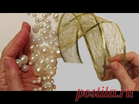 На изображении показаны две руки, занимающиеся работой с декоративными элементами. Левая рука держит ряд жемчужин разных размеров, поблескивающих белыми и слегка кремовыми оттенками. Эти жемчужины выглядят гладкими и переливаются на свету, создавая эффект роскоши и изысканности. Правая рука держит ленту золотистого цвета с полупрозрачной текстурой и блестящей окантовкой. Лента имеет сложную плетеную структуру, придающую ей нарядный вид. Освещение яркое и ровное, позволяющее увидеть все детали текстур и блеск поверхностей. Композиция сосредоточена на руке с жемчужинами и лентой, привлекая внимание к возможному процессу создания украшения или подарка к 8 марта. Сочетание жемчуга и золотистого цвета ассоциируется с праздником и эстетикой подарков ручной работы, что подчеркивается текстом о подарках и поделках на День Матери, предполагая создание оригинальных композиций для учителей в школу.