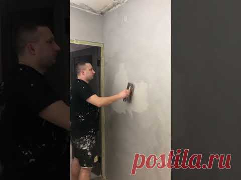 На изображении человек в черной футболке и шортах с белыми пятнами, выполняющий отделочные работы в помещении. Стены покрыты серой штукатуркой с использованием декоративной краски, что создает ощущение свежего ремонта. Лицо мастера сосредоточено, взгляд направлен на стену, движения уверенные. Виден проем двери в фоне, обозначенный желтой малярной лентой. Свет падает сверху, создавая мягкие тени, добавляя объем сцене. Декоративная краска подчеркивает эстетический аспект интерьера, как указано в тексте "Satin! Неймовірна декоративна фарба! #feidal #diy". Атмосфера работы предает обстановку решительной и творческой деятельности. Видна лестница и светлая дверь, что создает глубину пространства. Изображение передает элементы современного ремонта с акцентом на качество и стиль.