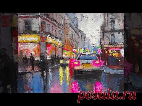На изображении представлена городская сцена, выполненная в технике акриловой живописи. Картина демонстрирует оживлённую улицу, где мокрая дорога отражает яркие огни автомобилей и витрин. На переднем плане изображён автомобиль с яркими фарами, создающий ощущение движения и динамики. Слева и справа видны здания с магазинами, чьи яркие вывески добавляют цвета сцене. Поэтому доминирующие цвета – жёлтый, розовый и оранжевый, контрастирующие с серым небом. Люди изображены в тёмных силуэтах, что подчеркивает вечернее время и дождливую атмосферу. Общее впечатление сцены создаёт атмосферу городской повседневной жизни, где свет и цвета играют важную роль в создании настроения. Освещение сцены создаёт игривые отражения на мокром асфальте, делая картину оживлённой и динамичной. Художественная композиция с перспективой улицы и движущимся автомобилем акцентирует внимание на глубине и пространственном восприятии.