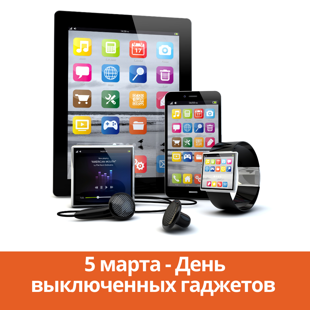 На изображении представлены различные электронные гаджеты, такие как планшет, смартфон, музыкальный плеер и умные часы. Устройства изображены яркими иконками приложений на экранах, что создаёт ощущение многофункциональности и современных технологий. Планшет и смартфон демонстрируют цветные иконки на фоне черно-белой фотографии с пляжем, что контрастирует их визуальную насыщенность. Музыкальный плеер показывает проигрывание трека, а рядом лежат черные наушники, отполированные до блеска. Умные часы стильно сверкают глянцевой поверхностью и отображают аналогичные иконки на своём небольшом экране. Общее расположение гаджетов перед светлым фоном создаёт упорядоченное и гармоничное ощущение современного цифрового мира. Яркая оранжевая полоса внизу содержит текст на русском языке, выделяя актуальный день, который призывает выключить устройства и насладиться реальностью.