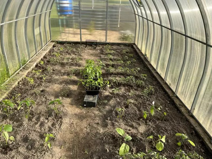На фотографии изображена теплица с арочной крышей, выполненной из прозрачного поликарбоната, что позволяет солнечному свету равномерно освещать внутреннюю часть. Внутри теплицы находятся ряды рассады, высаженные в тёмную богатую почву. Почва кажется хорошо обработанной и увлажнённой, что создает идеальные условия для роста растений. В центре теплицы виден ящик с рассадой перцев, а по краям аккуратно рассажены молодые растения, возможно, огурцы или помидоры. Теплица отделена от окружающего пространства, но через прозрачные стены заметно, что за ней есть зелень и небо, что создает свободное и просторное впечатление. Прозрачные стены теплицы создают ощущение величины и света. Отсутствие людей в кадре позволяет сосредоточиться на процессе роста и организации пространства. Данное изображение сопровождается текстом о том, что можно поместить в теплицу в марте для ускоренного созревания урожая. Это подчёркивает важность планирования сезонных работ в теплице и использует простые советы для увеличения урожайности.
