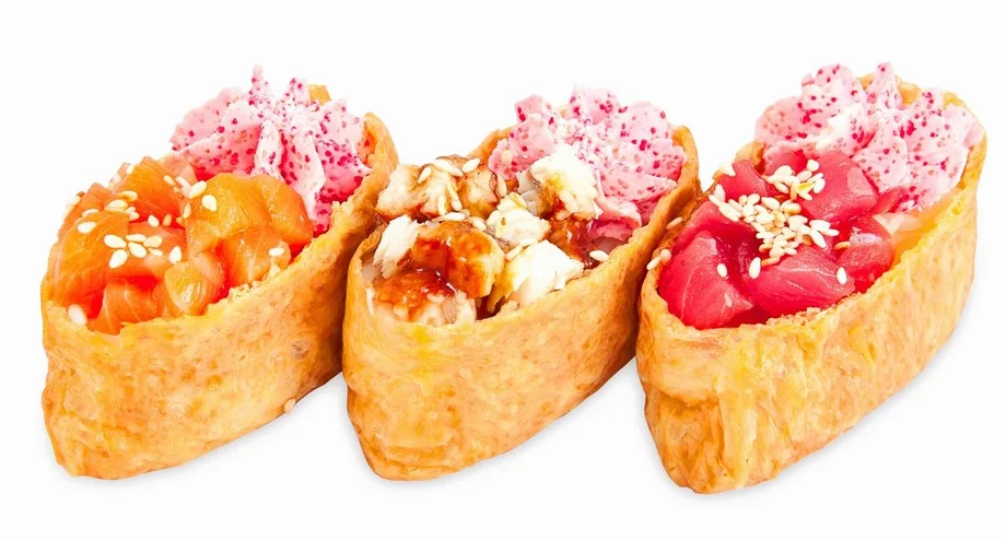 На изображении представлены три аппетитных суши в стиле инари. Каждый из них завернут в оболочку из тофу, имеющую золотисто-коричневый цвет и слегка шероховатую текстуру. Первая суши слева украшена кусочками ярко-оранжевого лосося, посыпанными белыми кунжутными семенами. Средняя суши демонстрирует разнообразие текстур, включая сыр и соус терияки, придающий глянцевый вид и добавляющий композиции сладковатый акцент. Третья суши характеризуется нарезанным розовым тунцом, который также усыпан белыми кунжутными семенами. Каждое из блюд дополнено розовым салатом, который создаёт контраст с насыщенными цветами рыбы и тофу. Композиция выполнена в минималистическом стиле на белом фоне, что акцентирует внимание на ярких цветах и текстурах суши. Освещение рассеянное, подчеркивающее свежесть ингредиентов. Текст "Виды суши: названия, описание и фото. Какие бывают суши и роллы?" может быть посвящён исследованию разнообразия японской кухни.