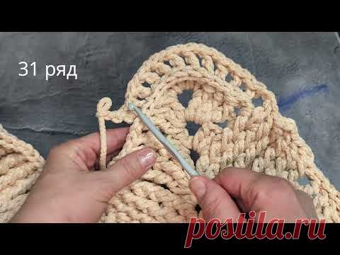 На изображении видно крупным планом руки, занятые вязанием крючком. Человек использует толстую полиэфирную нить кремового оттенка, текстура которой выглядит мягкой и слегка пушистой. На фоне видна серая поверхность, возможно стол, создающая контраст с более светлой нитью. Изображение наполнено теплом и домашним уютом, передавая процесс создания изделия ручной работы. На переднем плане две руки держат изделие; маникюр на ногтях, выполненный в нейтральных тонах, свидетельствует о внимании к деталям. Крючок находится в динамике, подчеркивая процесс вязания. На фотографии также присутствует текст "31 ряд", что может свидетельствовать о продвинутом этапе работы. Освещение мягкое, без ярких теней, передает атмосферу природы и спокойствия. Изделие, судя по всему, представляет собой часть процесса создания ковра из полиэфирного шнура, как упоминается в описании "Ковер из полиэфирного шнура ПРОМТЕКС / часть 4 заключительная/". Состав и структура снимаемого кадра сосредоточены на руках и детали вязания, без отвлекающих элементов, что подчеркивает мастерство и увлеченность процессом.
