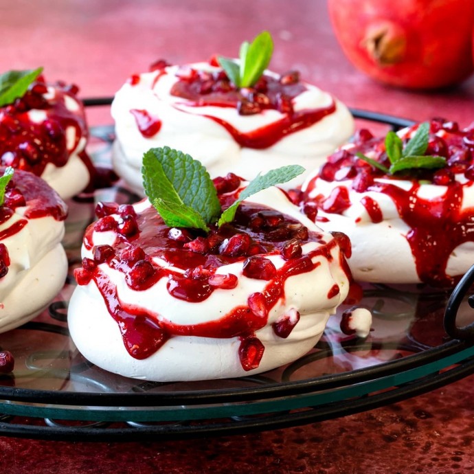 Павлова с гранатом Ингредиенты:Для безе:Белки, к. т. — 4 шт. Сахарная пудра — 220 г Яблочный уксус — 1 ст. л. Кукурузный крахмал — 2 ст. л.Для крема:Сливки жирностью 35% — 150 мл Сахарная пудра — 0,5 стак. Палочка ванили — 1 шт. Ягоды...