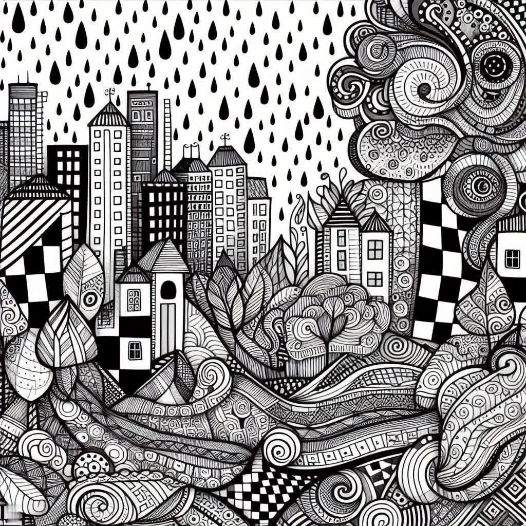 Городские зарисовки в стиле зентангл: абстрактный фон с дождём и необычными домами. Нейронная сеть Dalle - Dalle примеры промтов - Форум ИИ о нейросетях - Yes Ai