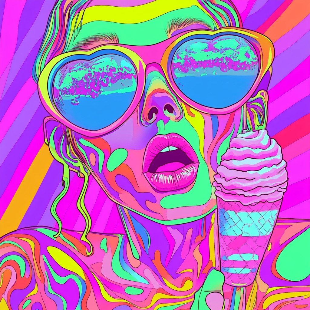 Крик в неоновом городе: психоделический портрет с сердцем и мороженым. Генерация из нейросети Миджорни - Midjourney примеры промтов - Форум ИИ о нейросетях - Yes Ai