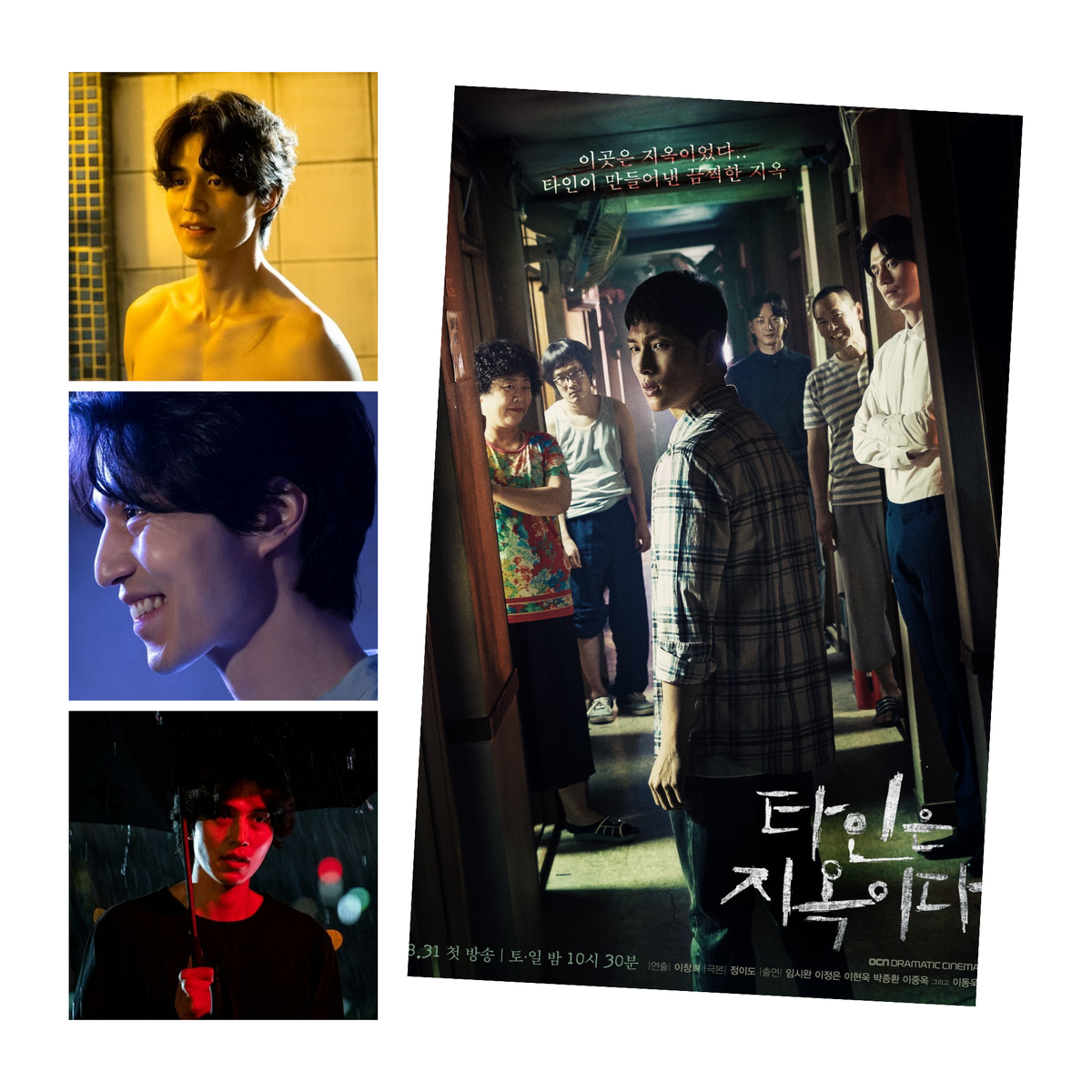 Изображение состоит из нескольких кадров: с левой стороны показаны три портрета одного человека, снимаемого в разных условиях. Верхний портрет обрамлен желтым светом, создавая тёплую атмосферу; человек без одежды, его поза расслабленная. Средний кадр, под синим освещением, демонстрирует улыбку на лице, выражающую радость и беззаботность. Нижний кадр снят в дождливую погоду: на тёмном фоне человек держит зонт, освещённый темно-красным светом, что добавляет мистики и напряженности. Справа крупный постер с корейскими надписями, на котором изображена группа людей, стоящих в узком коридоре, центральная фигура одета в клетчатую рубашку и повернута частично, ее взгляд направлен на зрителя, маркированная напряжением и ожиданием. Атмосфера изображения драматичная, с элементами триллера, а съемка выполнена в низком ключе, что подчёркивает серьёзное настроение. Постер содержит текст на корейском языке. Во всём изображении присутствуют элементы драмы и загадки из корейских дорам, которые делают сцены емкими и захватывающими.